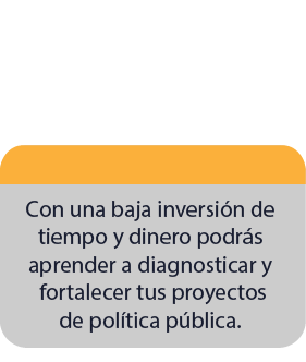 Es un curso en línea que te permite diagnosticar, diseñar e implementar proyectos, considerando las cuatro herramientas de una política pública exitosa: